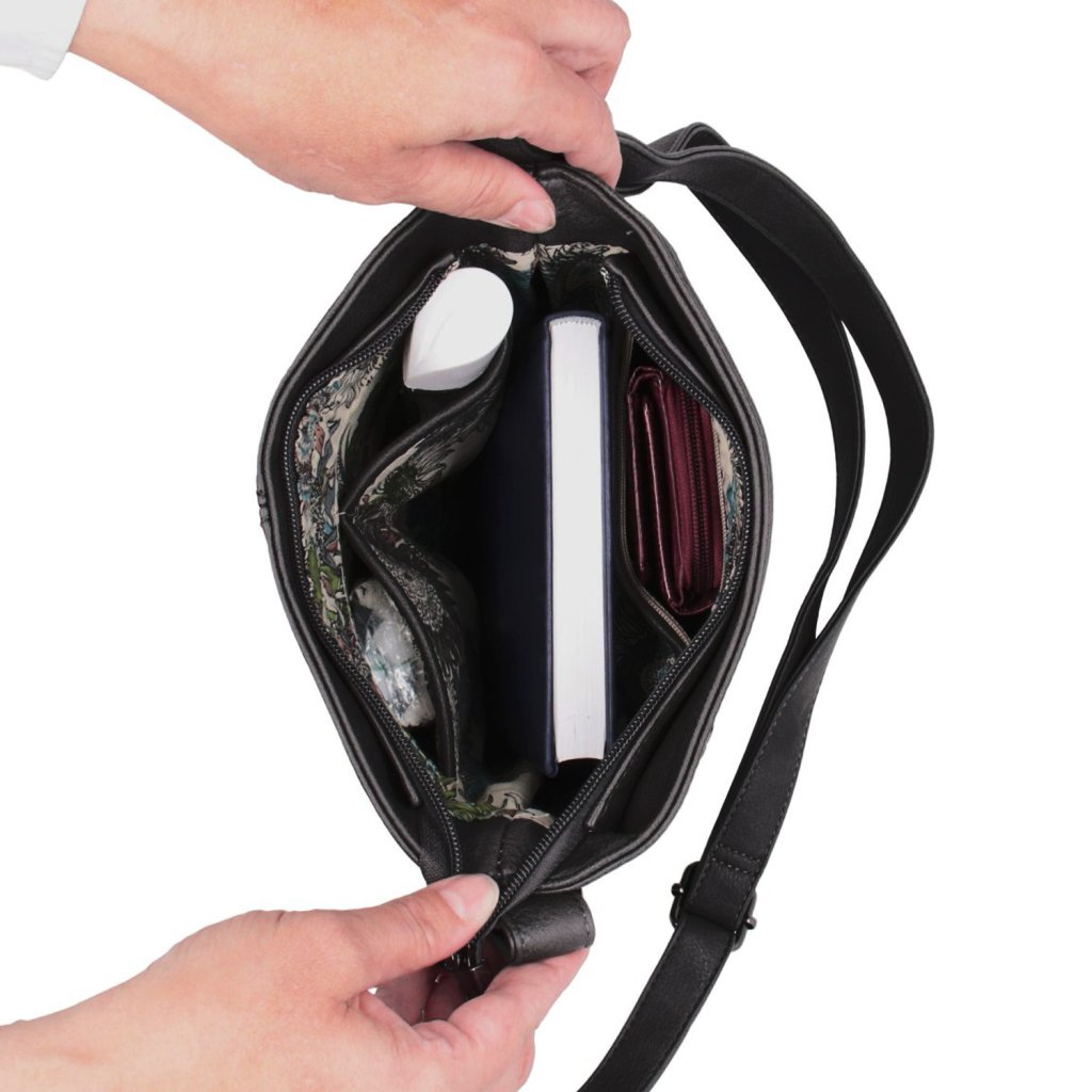 Crossbody s prošitím- Hlavní prostor kabelky se otevírá na zip.