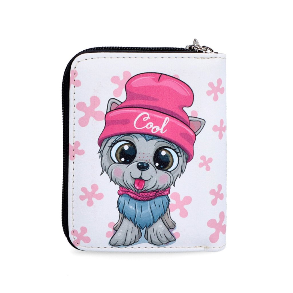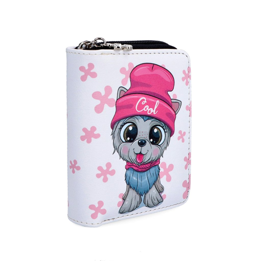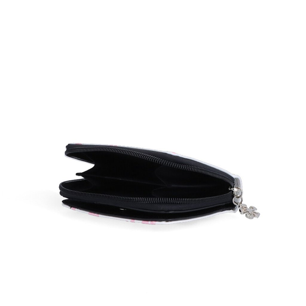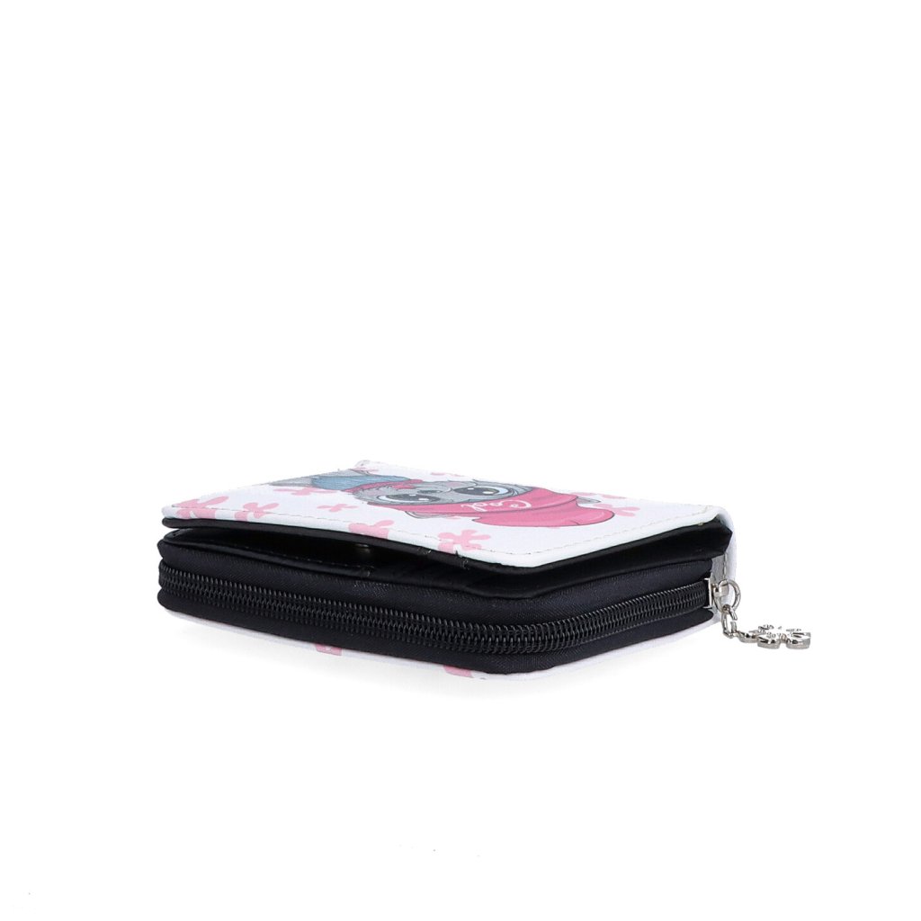 Dámská designová peněženka se zipem, zapínáním na cvoček a s barevným potiskem. Peněženka obsahuje:- 1 přihrádku na bankovky.