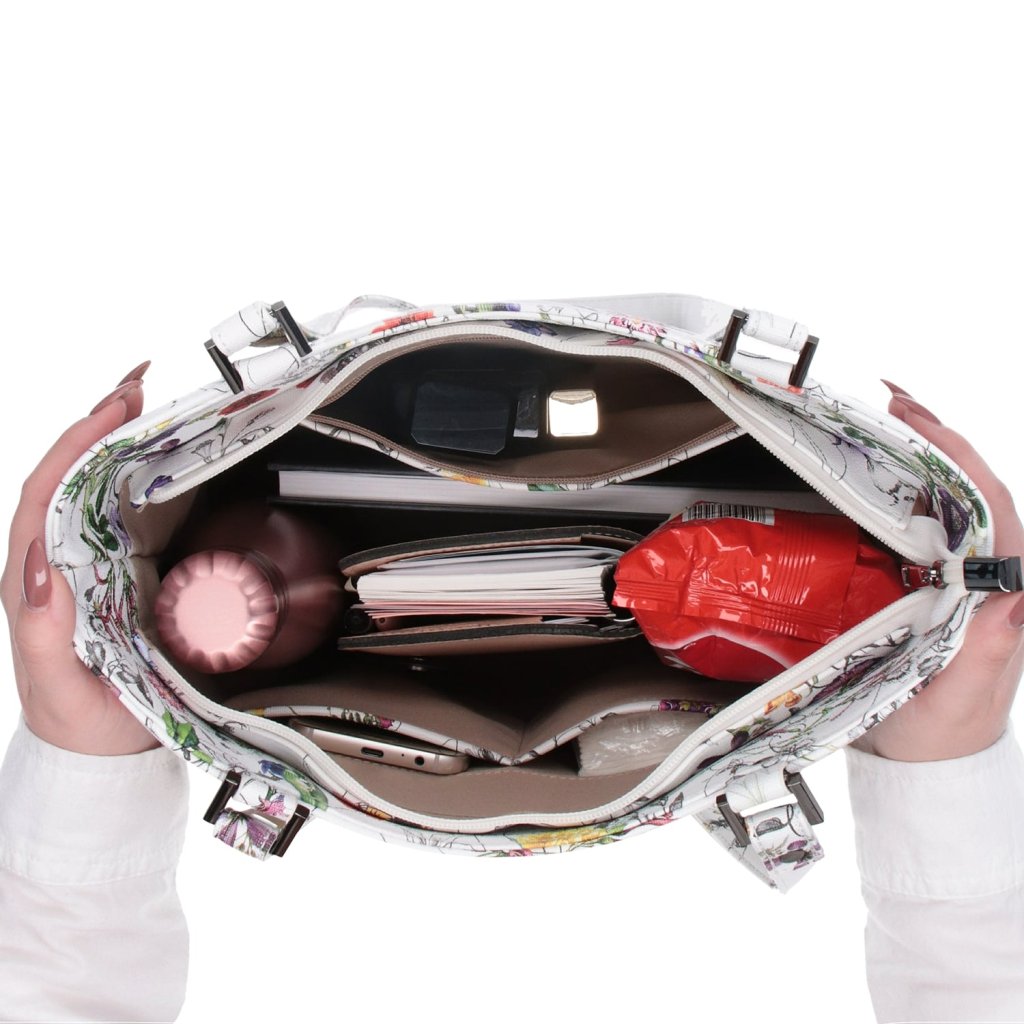 Květinová shopper kabelka- Kabelka je z horní části uzavřena zipem.