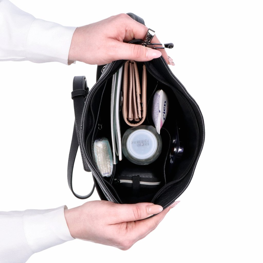 - Uvnitř jsou dvě kapsy a jedna kapsa na zip.