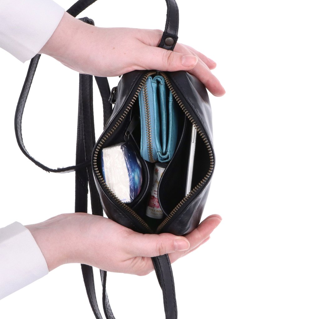 Malá crossbody kabelka z pravé kůže- Hlavní prostor se uzavírá na zip.