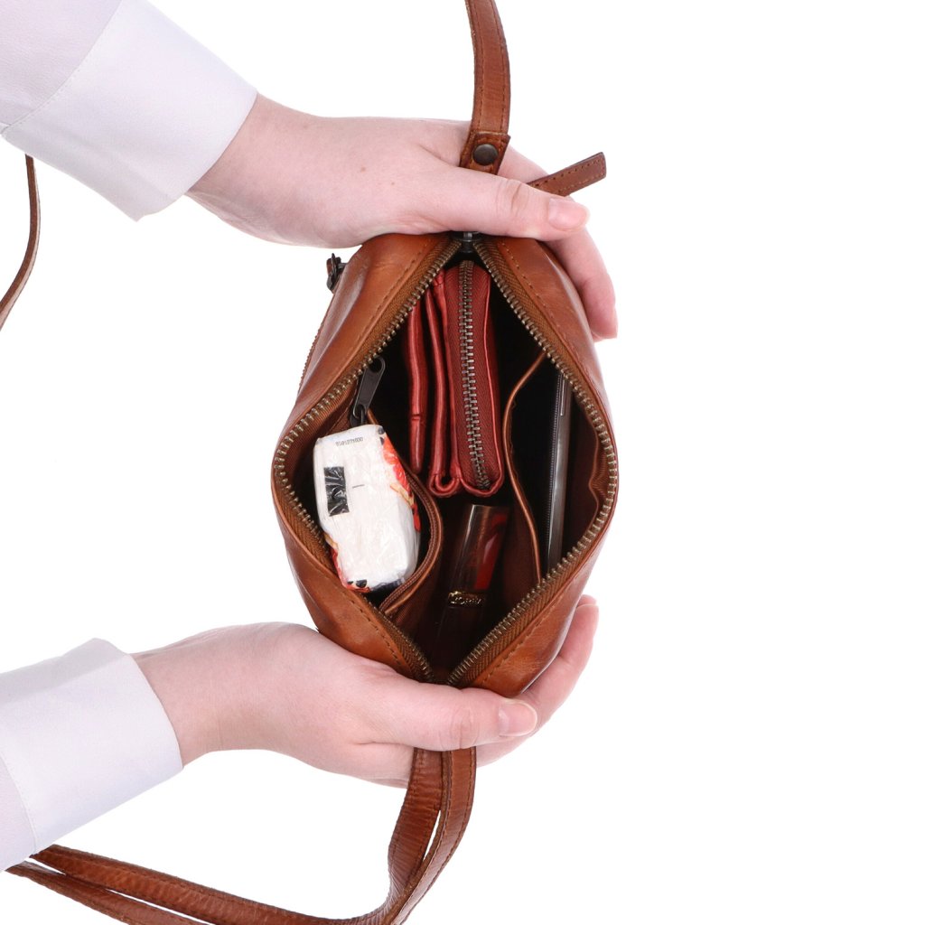 Malá crossbody kabelka z pravé kůže- Hlavní prostor se uzavírá na zip.