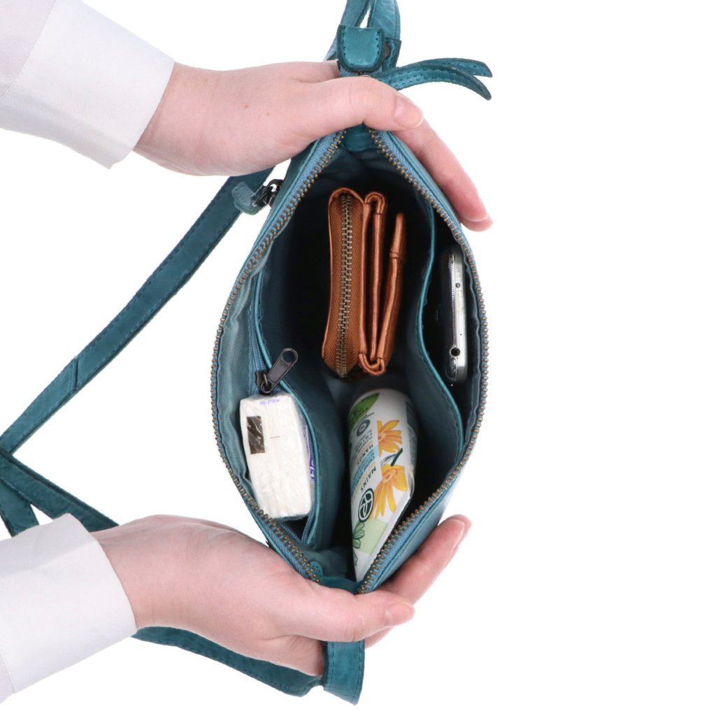 Malá crossbody kabelka z pravé kůže- Hlavní prostor se uzavírá na zip.
