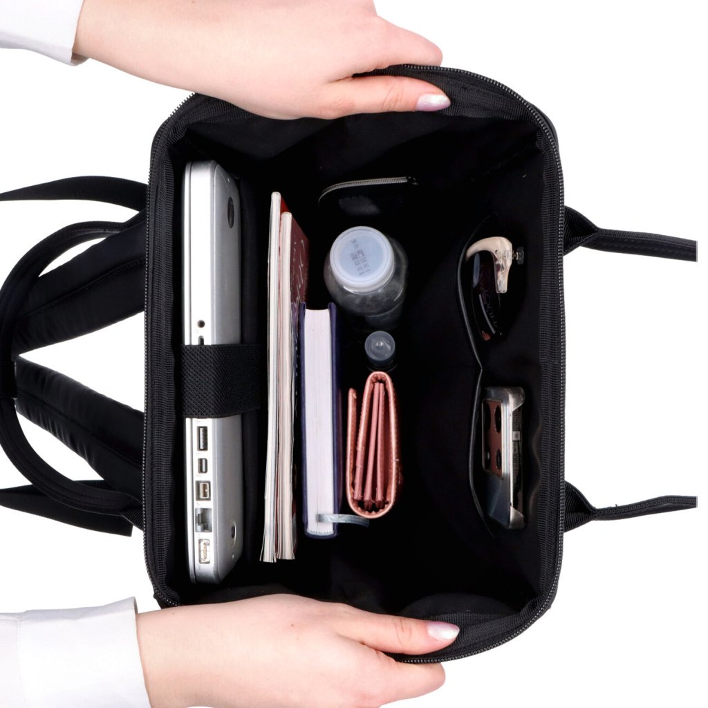 - Uvnitř jsou dvě kapsy na drobnosti a přihrádka na notebook.